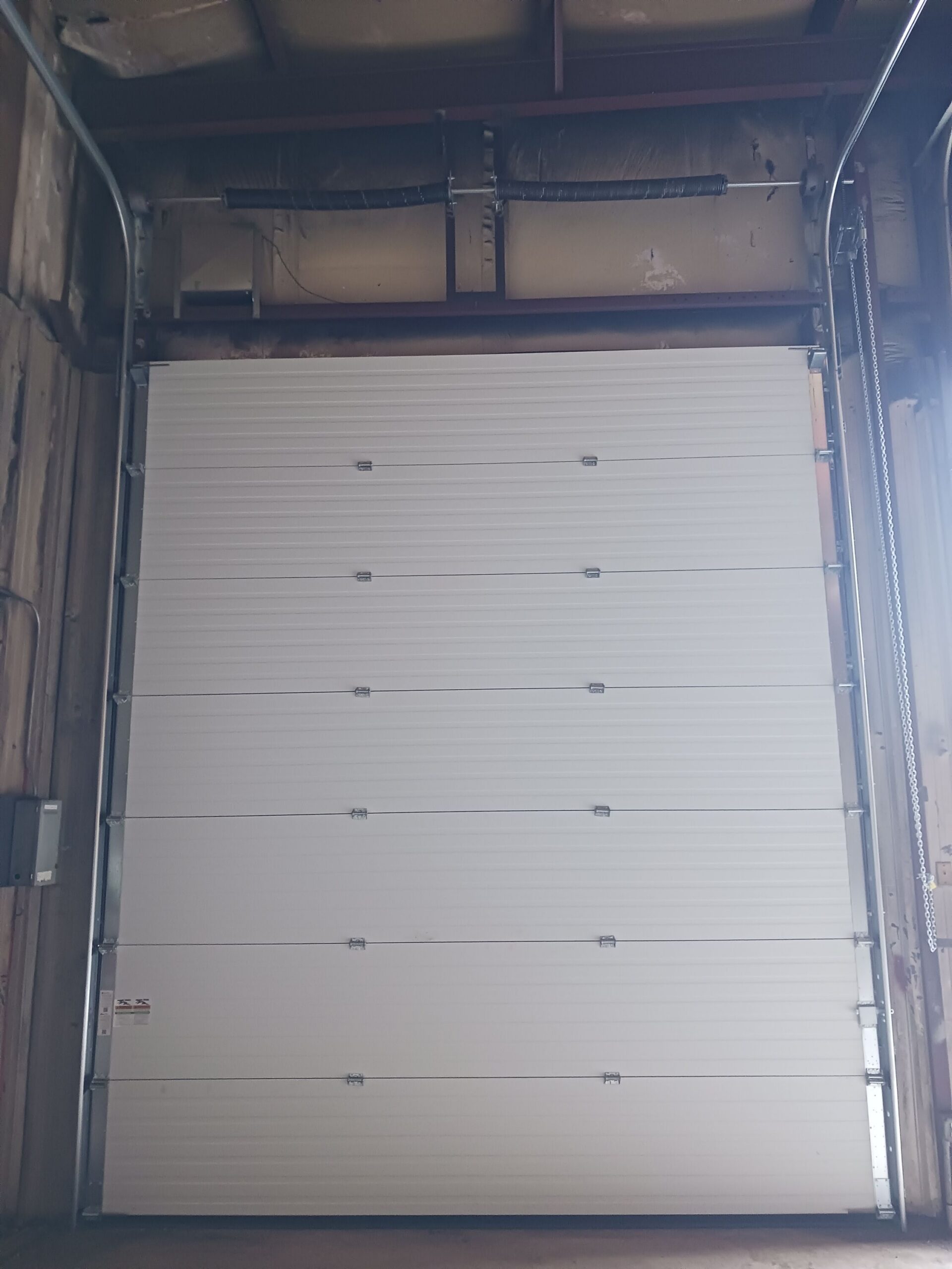 The deteriorated door was replaced, effectively restoring the building envelope. The new white ribbed panels align aesthetically with the corrugated metal exterior, presenting a professional facade. Built for industrial use, the door promises durability and longevity for the workshop.