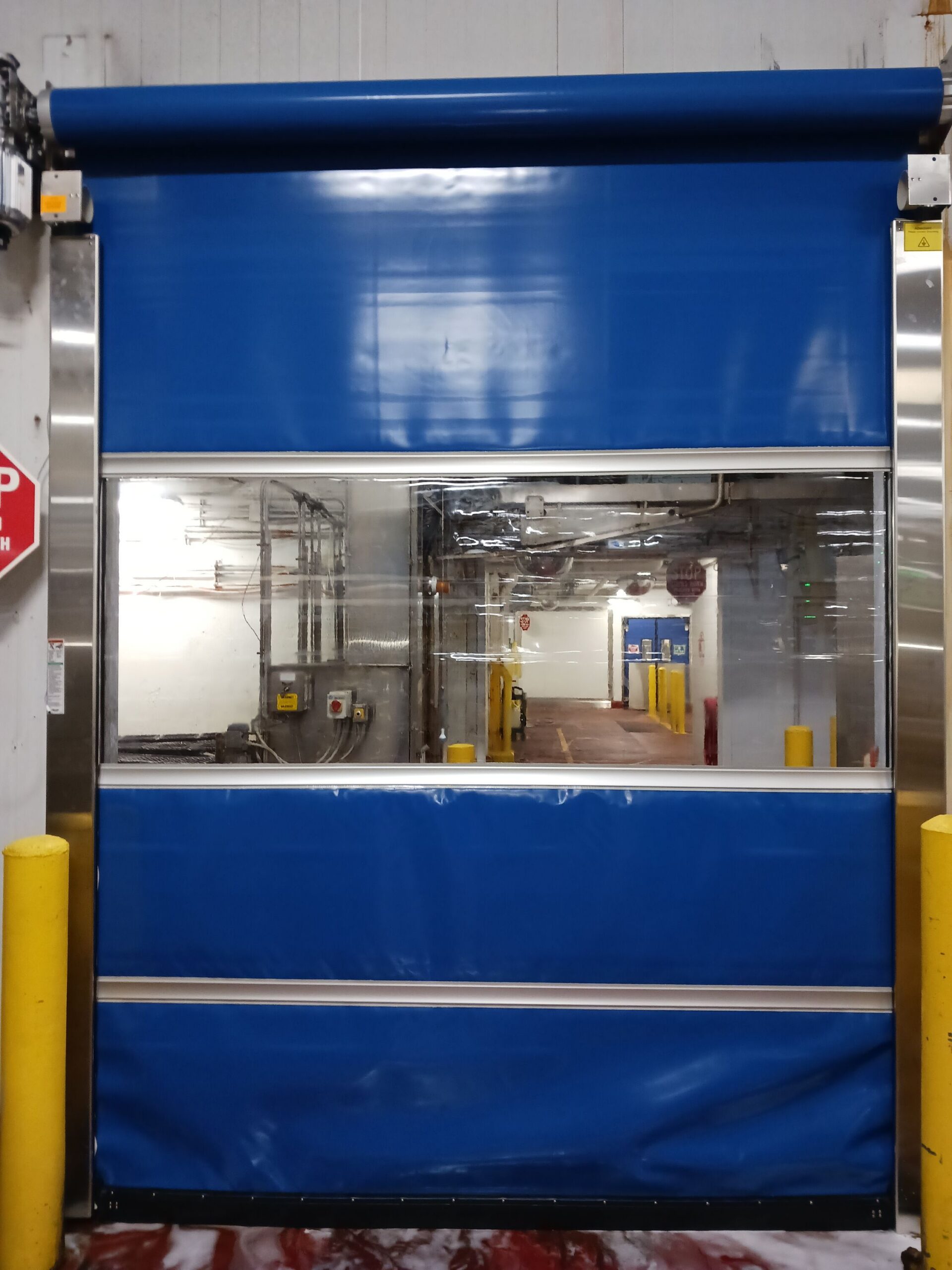 Zone separation in food processing environments sets a higher bar for door systems than almost any other application. The door at the production-to-non-production zone boundary at this Mississauga facility had to satisfy multiple requirements simultaneously: it needed to withstand daily foam cleaning and pressure washing with chemical sanitizers, minimize open time to prevent cross-contamination between zones, provide visibility for personnel during production traffic to prevent collision incidents, and comply with food safety audit standards that are non-negotiable in a regulated production environment.